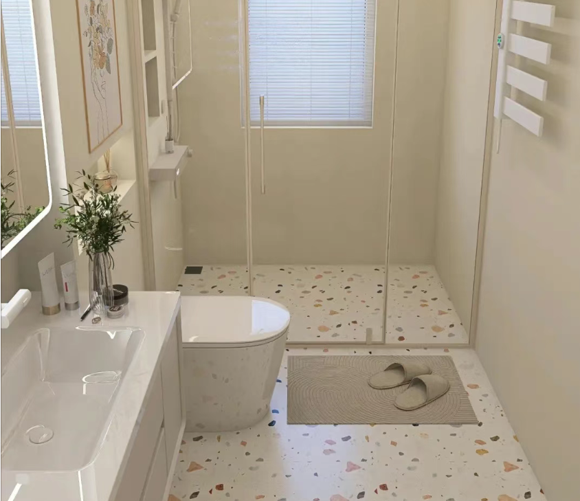 The bathroom is made of terrazzo. The effect is truly breathtaking, lasting for a thousand years. It's so beautiful that it's almost